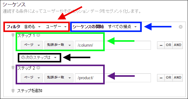 これらの条件は、集計期間中の閲覧ページの読まれた順番の条件でセグメントすることになる。「同じセッション内で、読み物ページを先に読んで、その後商品ページを閲覧」しても該当するし、「あるセッションで読み物ページだけ読んで、その後の別のセッションで商品ページを閲覧」しても該当するセグメントということだ。
