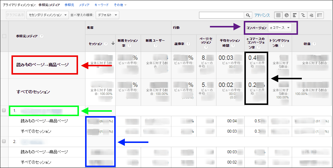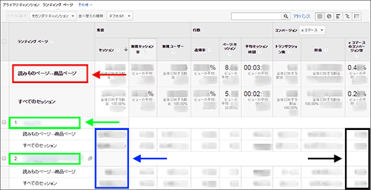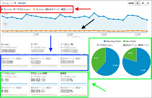 読み物ページから商品ページにまで関心を寄せている人たちなので、「ページ/セッション」が多く、「平均セッション時間」は長く、「直帰率」は低く、「新規セッション率」は低いのが普通だが、実際のところそうなっているだろうか。