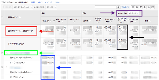 しかもコンバージョン指標で「eコマース」を選択(図6紫枠部分)して、eコマースのコンバージョン率を確認してみると、該当セグメントを掛けた方のコンバージョン率が高い(図6黒枠部分)という、良い結果になっていた。この場合、思惑どおり読み物コンテンツが成果にも結びついていることがわかった。