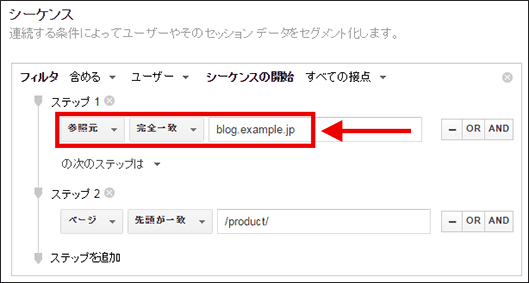 今回作成したいセグメントは「読み物ページ閲覧のあとに商品ページを見たユーザー」だ。図4のように条件指定しよう。