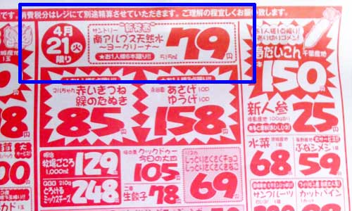 当然、「版下(印刷するためのデザイン)」はその前に制作されますし、目玉商品の手配はさらにそれ以前です。小売業界の習慣的に「ヨーグリーナ」の発売日当日には、目玉商品として手配されていたと考えるのが自然です。そしてチラシの「掲載場所」によって、前述の2説と、サントリーの説明は輝きを失います。
