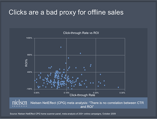 現状、ウェブにおける重要な指標は「CTR(クリック率)」です。たとえば、リスティング広告のクリック単価、A/Bテストの効果の指標など、クリックがあってコンバージョンするという前提で成果を測定してきました。このクリックを指標とする広告効果測定では、オフラインの動きを把握できません。