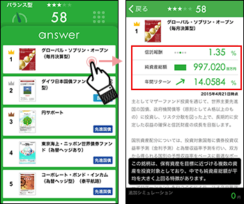 飯田:すでにネットで投資をしている方にフォーカスして、次の購入商品を決める手助けするために作られたのがこの「answer」です。本来は、まだネットで投資をしていない方も巻き込んでいければいいんですが、そこまでやるとツールの話に留まらず投資信託に関する情報も必要になります。ですから、最初のバージョンとしては、ネットですでに投資信託を持っている方が対象となります。