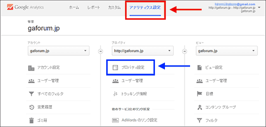 ユニバーサル アナリティクスではアナリティクス設定のみで機能は有効になる。具体的にはアナリティクス設定の画面(図1赤枠部分)で、プロパティ設定(図1青枠部分)をクリックする。