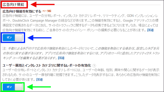 そして設定の方は、「ユーザー属性とインタレスト カテゴリに関するレポートの有効化」の方を「オン」(図2緑枠部分)にすれば大丈夫だろう。なぜ利用者の属性や関心分野がわかるのか、といった仕組みについても、前出の記事を参照してほしい。