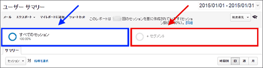 まずレポート画面の上部にある「+セグメント」(図3赤枠部分)のエリアをクリックしよう。ブラウザ表示の横幅が狭い場合は、すべてのセッション(図3青枠部分)の下に並んで表示される。