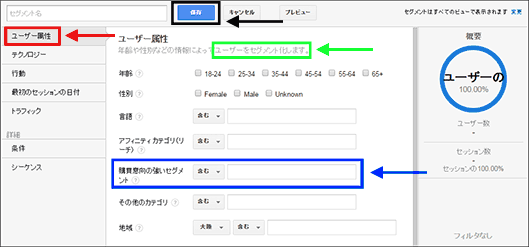 これで新規セグメント作成作業は終了だ。なおこのセグメント設定はユーザーベースのセグメント(図5緑枠部分)である。