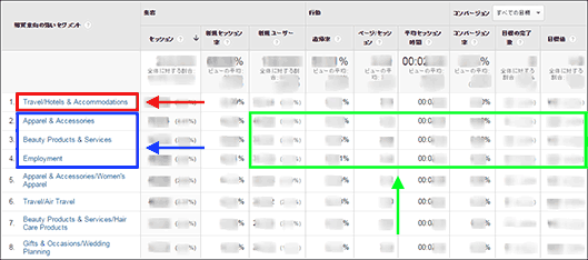 一番上に表示されている購買意向の強いセグメントは、自分自身のサイトのカテゴリになっているのが一般的だろう。今回の例は旅行サイトのデータなので、一番上のカテゴリは日本語にすると「旅行/ホテルと施設」だ(図7赤枠部分)。当然だが、1位は当たり前な結果になる。見るべきところは2位以下の上位の項目だ。