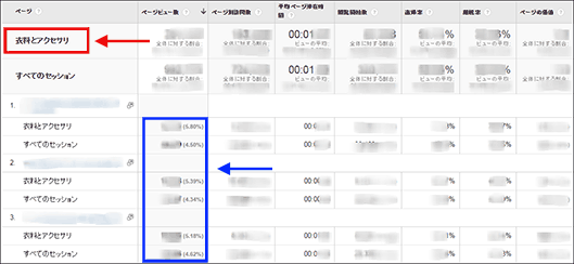 eコマースサイトなので、特定の商品カテゴリや特定の商品に偏った見られ方がされていないかどうかを見ていく。特に上位のページに関して、ページビュー数の割合を見くらべて(図9青枠部分)、該当セグメントと親和性が特に高いページやコンテンツ群がないかを見ていこう。
