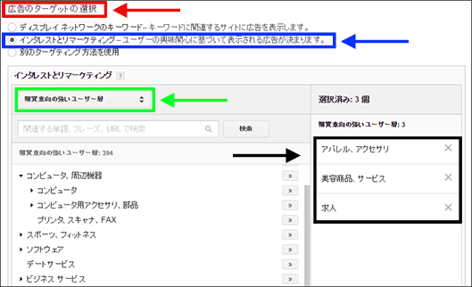 広告効果の高そうなユーザー層が見つかったら、AdWordsの広告のターゲットの選択の設定箇所(図10赤枠部分)で、「インタレストとリマーケティング」を選択し(図10青枠部分)、「購買意向の強いユーザー層」(図10青枠部分)の選択肢から、購買意向の強いユーザー層(ここでは、「アパレル、アクセサリ」「美容商品、サービス」「求人」)を選択(図10黒枠部分)して広告グループを作成して、実際のキャンペーンを実施してみよう。
