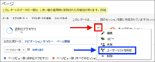 また自社サイトを訪問したユーザーに対するリマーケティング広告を出すこともできる。Google アナリティクスを開き、該当のセグメントの右側にある下矢印のマーク(図11赤枠部分)をクリックし「ユーザーリストを作成」(図11青枠部分)をクリックしてAdWordsのリマーケティングリストへの登録作業を行えばよい(詳細は割愛するが、AdWordsアカウントとの連携を事前にしておく必要がある)。