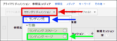 次に「セカンダリ ディメンション」(図6赤枠部分)をクリックし、出てきたプルダウンメニューから、「ランディング ページ」を選択する。