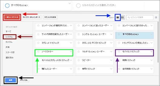 「ノーリファラー」セッションのセグメントは、まず「システム」(図2茶枠部分)をクリックして右側に表示されるセグメント候補の中から「ノーリファラー」(図2緑枠部分)をクリックして、「適用」ボタン(図2黒枠部分)をクリックすれば、このセグメントが表示されているレポートに適用される。