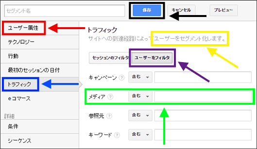 このセグメントは「ユーザーベース」のセグメント(図3黄枠部分)だが、セッションベースのセグメントにすることもできる。標準では「ユーザーをフィルタ」(図3紫枠部分)が選択されているはずなので、今回はこちらのユーザーベースのセグメントにする。