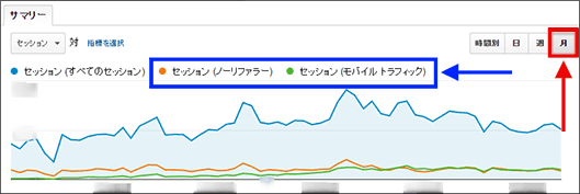 図6はあるサイトの全体のセッション、「ノーリファラー」セッション、「モバイル トラフィック」セッションの長期トレンドを表示したものだ。
