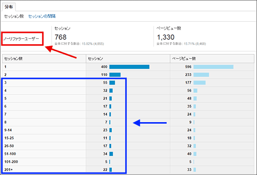 ユーザー数が同一なのは当たり前として、セッション数にあまり違いがない(741と768)という点が注目される。これは何を表しているかと言えば、過去ノーリファラーで訪問しているユーザーがその後、検索エンジンやその他の参照元などからの利用をほとんどしていないということになる。つまり初回訪問から最新の訪問まで、ズーッとノーリファラーで訪問している特異なユーザーであるということが言える。