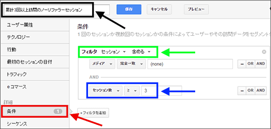 そこで今度は、「ノーリファラー」セッションに加えて、過去から累計3回以上サイトに訪問したセッションにさらに絞り込んで、どのページから閲覧を開始したのかを確認することで、ユーザーの閲覧の特徴をあぶり出してみる。そのために、さらに条件を加えたセグメントを作る必要があるので、図9のように「条件」分類の設定画面(図9赤枠部分)で、累計訪問回数が3回以上という条件(図9青枠部分)を追加したセッションベース(図9緑枠部分)のセグメント「累計3回以上訪問のノーリファラーセッション」(図9黒枠部分)を作成してみた。