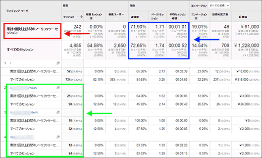 「直帰率」や「ページ/セッション」「平均セッション時間」の3つの指標(図10青枠部分)は全体とあまり違いはなく、特にヘビーユーザーということでもない。ただ該当セグメントを掛けた場合に、上位のランディング ページは大きな違いがあった(図10緑枠部分)。感覚的に言えば、これらのページは習慣性のあるユーザーが取りそうな閲覧開始ページのパターンであることは想像できた。