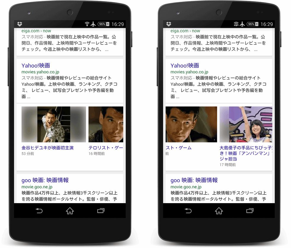 検索結果にカルーセルが登場、最新のニュースや話題の映画を表示