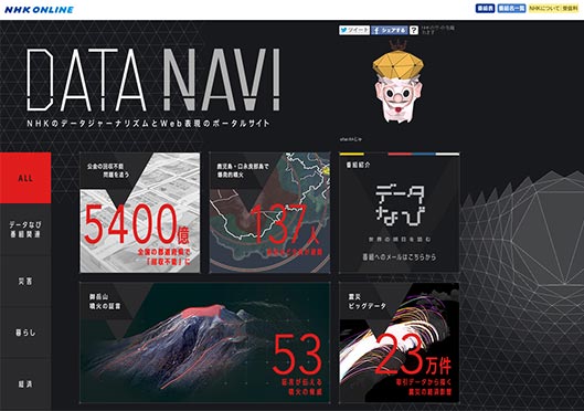 データから情報を読み解いて可視化する「NHKのデータジャーナリズムとWeb表現のポータル」サイトで、さまざまなデータを「災害」「くらし」「経済」などの切り口で時系列に変化するグラフなど興味深い内容になっています。