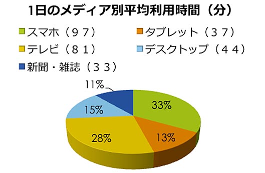 桑原さんのこの認識は各方面のデータにも現れているようです。たとえば、2015年6月初めにワシントンで開かれた「世界ニュースメディア大会(67th World News Media Congress)」会場で公表されたデータによれば、世界の人々の平均1人1日当たりのスマホとタブレットの使用時間は2時間以上、一方テレビは81分でした。