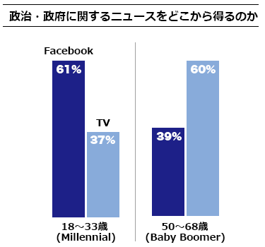 また、米国の調査によれば18~33歳(Millennial)は、政治関連の情報のニュースソースとして、テレビよりもFacebookを利用しているという調査結果も発表されています。