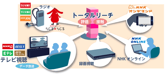 また、「放送」ばかりでなくこれからのインターネットなど多様な形でのNHKコンテンツへの接触を把握するため、メディアの枠を越えた新たな評価手法「トータル・リーチ」も開発し、準備が進められています。