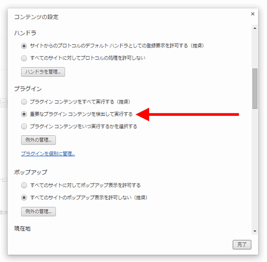 - [プラグイン]セクションの設定を「重要なプラグイン コンテンツを検出して実行する」を選ぶ