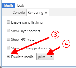 - [Rendering]タブに切り替え、下のほうにある[Emulate media]にチェックを入れ、ドロップダウンリストで「print」を選ぶ。