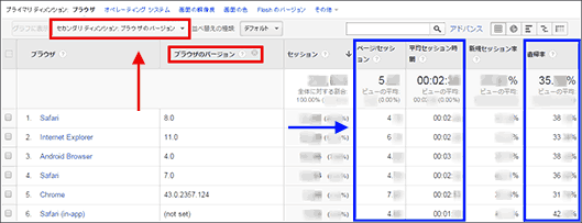 幸い、図1の例では上位の一定以上のセッション数のあるブラウザのバージョンで、問題のありそうなものは存在していなかったが、気になったブラウザのバージョンが何かあったという仮定で、解説を進めていく。