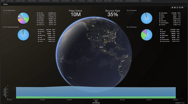 ユーザーの訪問をリアルタイムで表示している画面。地球に表示される点がリアルタイムのアクセスで、緑はSLAで定めた速度を満たしているものなど、色でパフォーマンスがわかる。