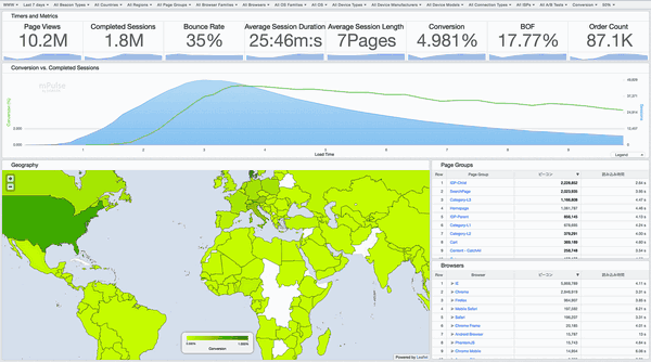 mPulseは全ユーザーのデータを測定しているので、「このページグループの表示速度をこれぐらい改善したら、コンバージョンがこれぐらい増えるはず」という分析を行えるのです。こうした判断は、サンプリングデータでは難しいはずです。