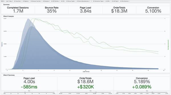 たとえば上の画面例では、ページ読み込み時間を585ミリ秒短縮すれば、コンバージョン率が0.089%ポイント向上し、注文額が32万ドル増えると試算されている。