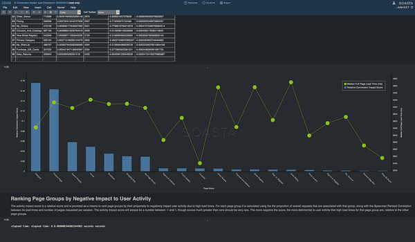 この画面では、横軸がページグループで、緑色の線グラフがページ読み込み時間の中央値、青色の棒グラフが相対的なコンバージョンへの影響度を示している。