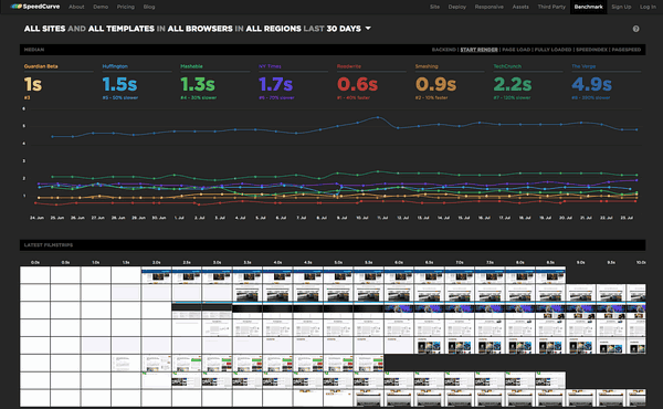 競合サイトとの速度比較も表示できる。画面の下には、各サイトの経過時間(横軸、0.5秒単位)ごとの画面状態を並べて表示している。