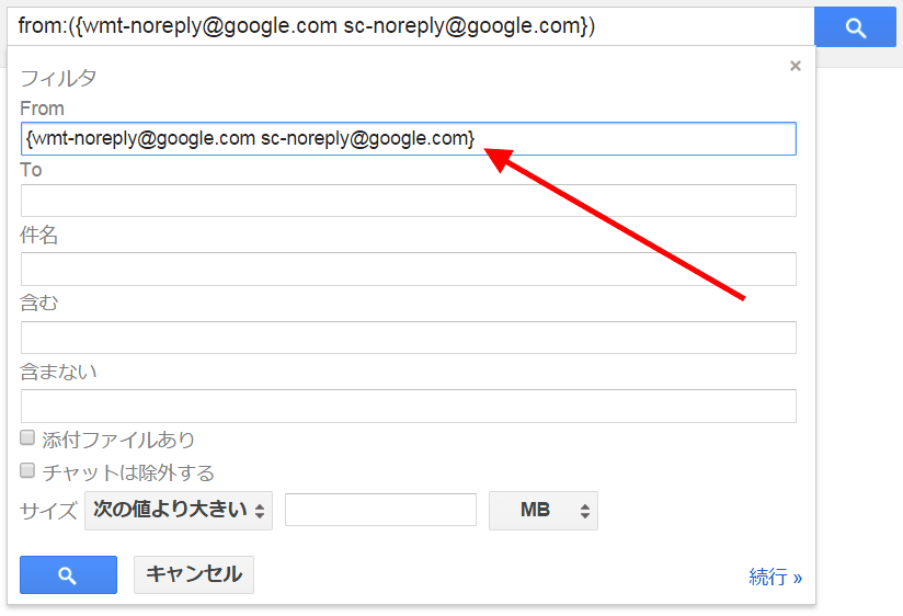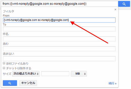 これは、fromアドレスが「wmt-noreply@google.com」または「sc-noreply@google.com」のメールを処理対象にするという指定です(「{}」は「そのなかに書いたもののいずれか」の意味)。
