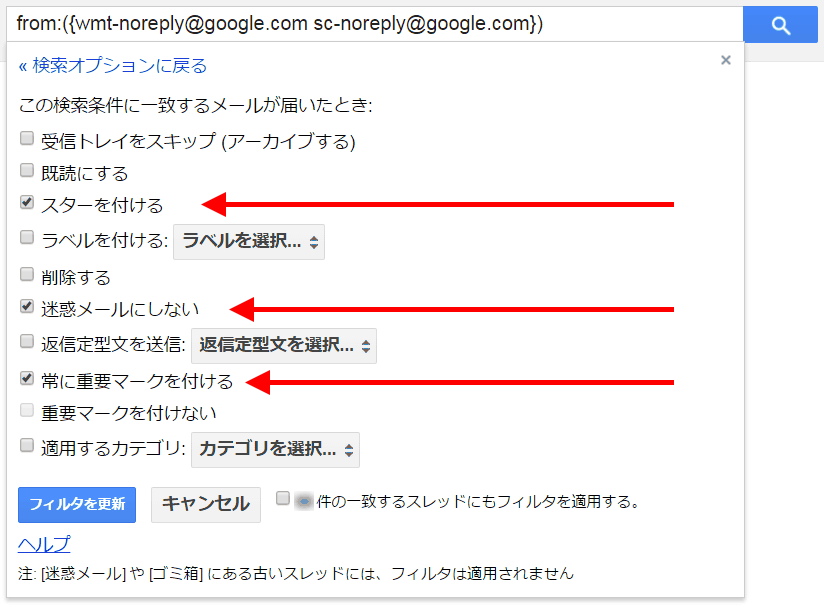 要は、Search Console(ウェブマスターツール)から届くメール通知は、何があっても迷惑メールとして扱わず、必ず重要メールとして受信トレイに表示するというフィルタです。