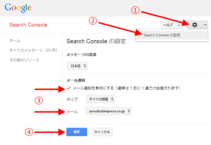 「メール通知」を設定して、何かサイトに関して重大な問題があったときには、グーグルからメールが届くようにしておく(スパム的なSEOをしているサイトだとグーグルが判断したとき、サイトがハッキングされているときなど)。