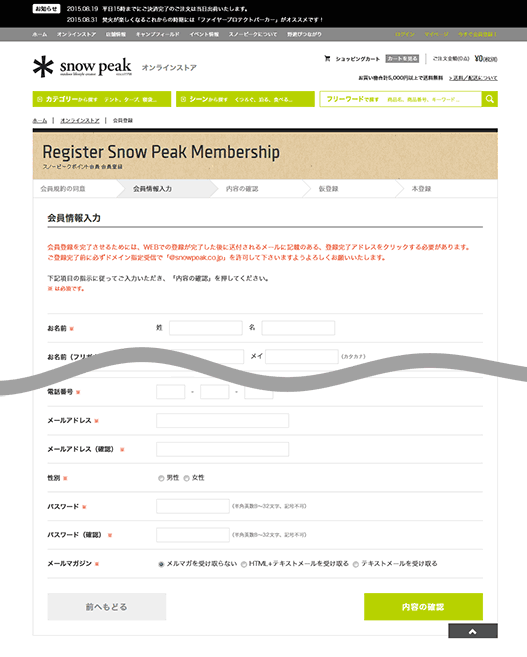 今回「惜しい!」エントリーフォームとして紹介するのは、株式会社スノーピーク様の「オンラインストアの新規会員登録」フォームです。