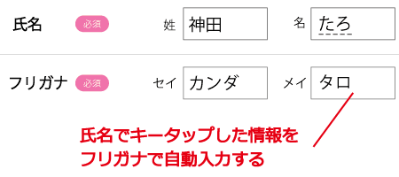 「姓」「名」に対する、フリガナの「セイ」「メイ」入力欄があるとして、ユーザーが「姓」欄に入力したら、該当するカタカナ(またはひらがな)を、フォーム側の処理で自動、かつリアルタイムに入力することでユーザーの手間を減らせます。
