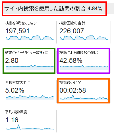 検索後の時間、平均検索深度 ―― 逆に、これら2つの指標が大きければ、ユーザーはサイト内検索に多くの価値を見出していると言えるだろう。