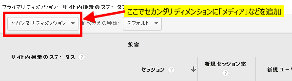 僕が追加したいのは「メディア」だ。「サイト内検索を使った訪問」と「サイト内検索を使わなかった訪問」それぞれについて、トラフィックメディアごとの内訳を教えてくれる。