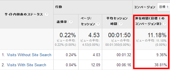 ページ/セッション、平均セッション時間 ―― サイト内検索を使った訪問の方が閲覧ページ数とセッション時間が多い場合は、ウェブサイトのコンテンツが適切であることを示している(つまり、ユーザーは探しているコンテンツを見つけている)。