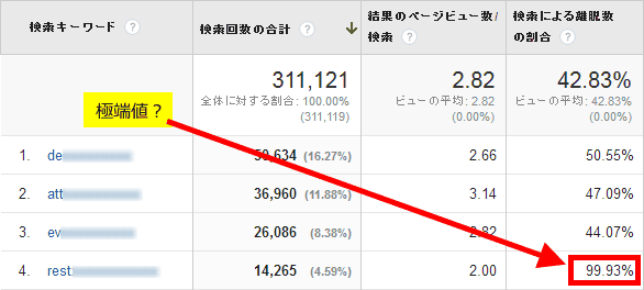 各エンゲージメント指標を見て、検索キーワード間で差がないかを確認する。ある検索キーワードの検索による離脱数の割合または再検索数の割合が異常に高い場合、たいていは、訪問者が探しているコンテンツがなかった可能性が高い。