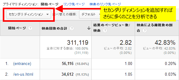 セカンダリディメンション ―― 僕なら、「前のページ遷移」ディメンションを追加したい。これは、ユーザーがサイト内を移動する際に遭遇する問題に対して、その移動の様子を分かりやすくしてくれる。