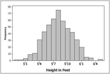 典型的な釣り鐘型の分布が見られるでしょう。最も分布が多いのは平均身長5フィート10インチ(178cm)あたりで、それより高い人・低い人は左右同じように分布しています。