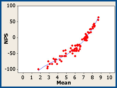 回帰方程式は:NPS = - 1.55 + 0.39*Mean - .07*Mean2 + .006 Mean3 [Adj-R2=96%]