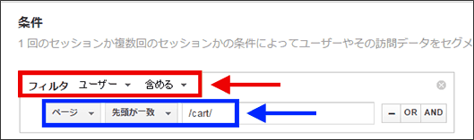 次に「カート投入から購入完了までの数ページを閲覧した」という条件は、今回の例では「ページ」「先頭が一致」「/cart/」とする。これには「購入完了ページ」が含まれていても構わない。あとで対象外とするリストで指定するからだ。