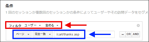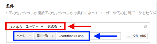 条件指定の上部は図4と同じ内容だ(図5赤枠部分)。その下は購入完了ページを閲覧したという意味で、「ページ」「完全一致」「/cart/thanks.asp」と指定する(図5青枠部分)。