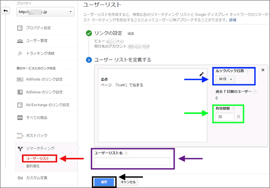 あとは、ユーザーリストに名前を付けて(図6紫枠部分)、保存(図6黒枠部分)すれば、AdWords側でリマーケティングリスト用のユーザーリストとして選択できるようになる。